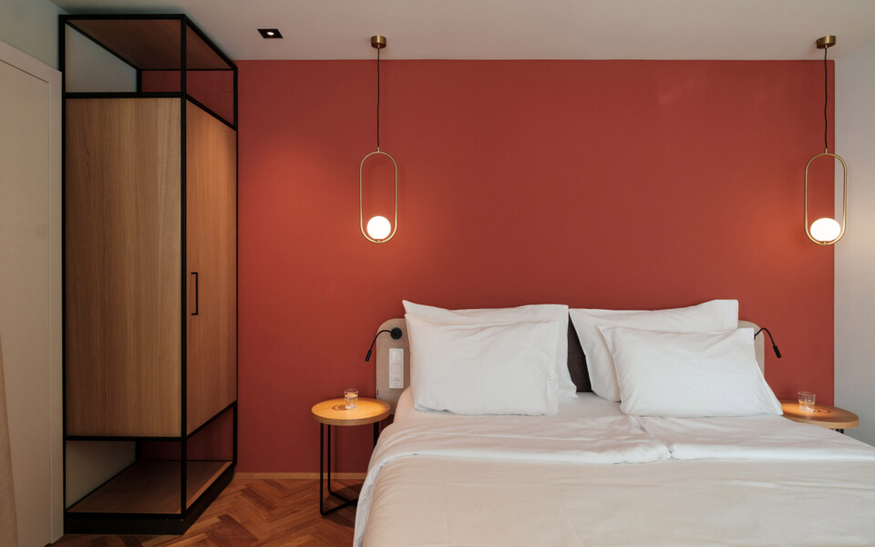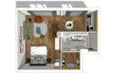 The studio apartments impress with an open, well-structured layout. Living and sleeping areas flow seamlessly into one another and include a comfortable double bed, a functional desk, and a cosy sitting area. The compact kitchenette is fully equipped and complemented by a small, inviting dining area. The bathroom has a washbasin, shower, and toilet. The windows of these charming studios open onto a green inner courtyard.