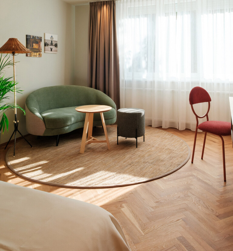The long-stay apartments were extensively renovated in 2025 in accordance with our Circular Living Standard – inspired by the principles of circular economy and cradle-to-cradle. For interior construction and furnishings, this means: